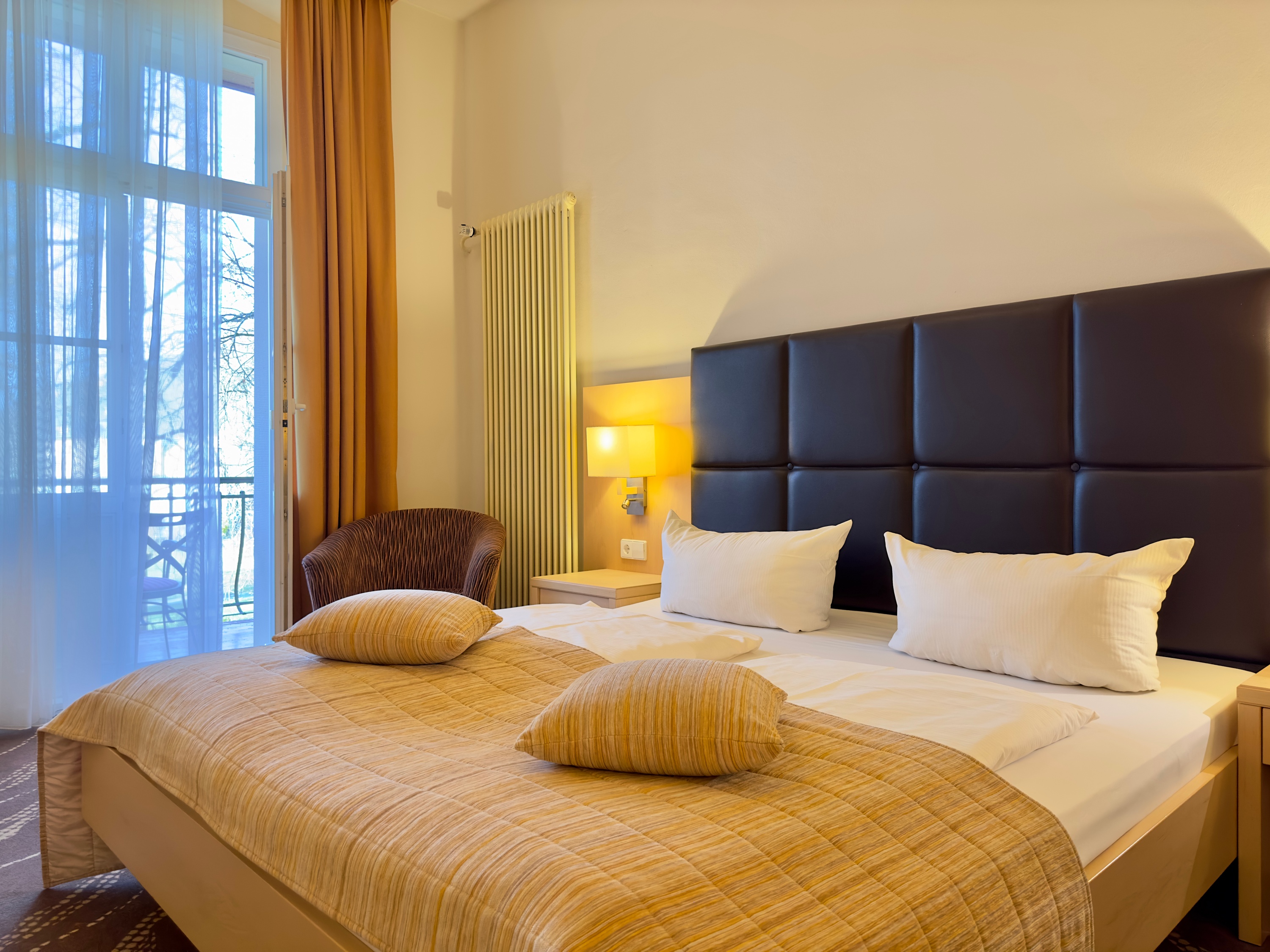 In der historischen Villa Sendig wohnen Sie in unseren komfortablen Zimmern mit großzügigem Balkon und Sitzgelegenheiten sowie Duschbad.